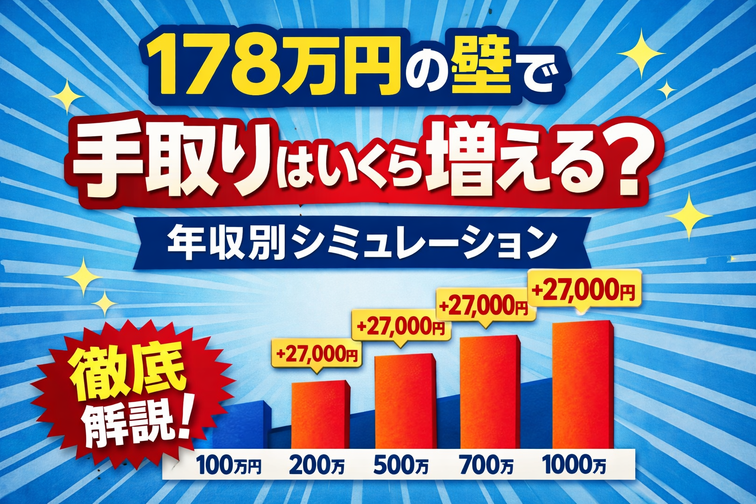 178万円の壁が撤廃されたら手取りはいくら増える?【年収100万刻み・1000万円まで】